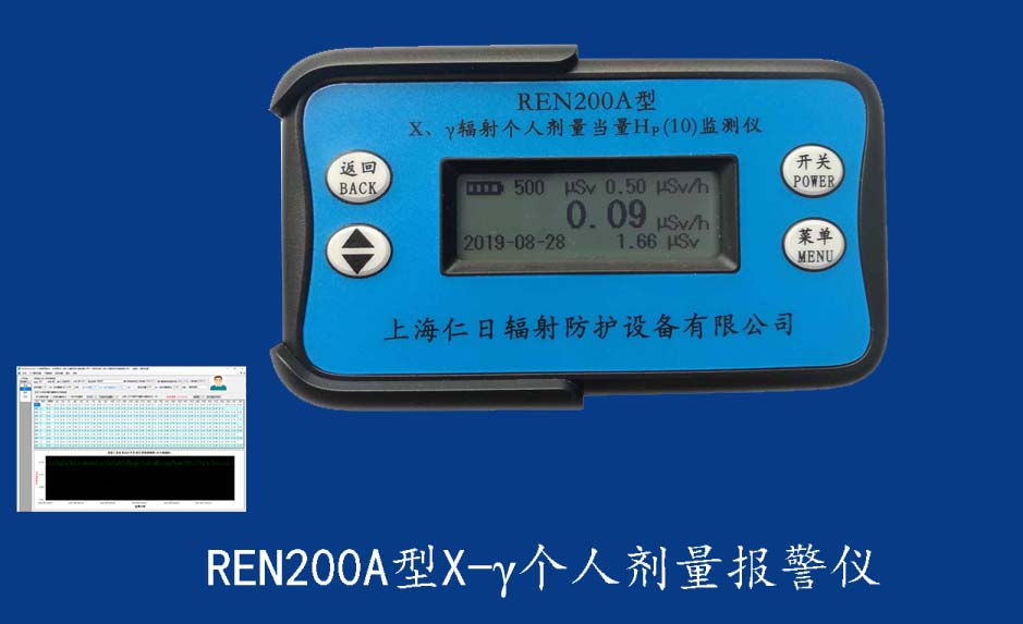 REN200A型X、γ辐射个人剂量当量HP(10)监测仪(简称:个人剂量报警仪)内置高灵敏度盖格计数管为探测器,主要用来监测各种放射性工作场所的X、γ以及硬β射线的辐射,具有响应快,测量范围宽的特点。能显示工作场所的剂量当量率和累积剂量,更换电池时,日期及累积数据能永久保存。可选配RenRiPersonal个人剂量管理软件,该软件可存储多个人的历史数据,能记录日累积、月累积、年累积、辐照时长、计算平均剂量率、扣除或不扣除本底辐射,且以文字和图谱的方式展现数据。广泛应用于核电站、加速器、钢铁、化工、同位素应用、工业X、γ无损探伤、放射医疗、钴源治疗、γ辐照、放射性实验室、核设施周围环境监测等领域中的工作人员进行个人安全防护监测及放射性提示。&nb